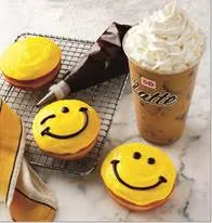 The Smiley Face Donut is a filled yeast shell donut decorated with an adorable smiley face. Fillings for the donut will vary by market to cater to local tastes, and include fillings such as Jelly, Bavarian Kreme and Chocolate Kreme.