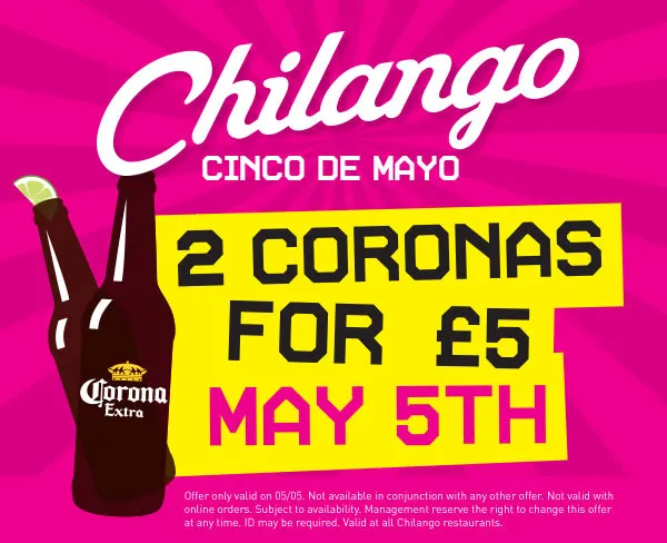 "Get a special kind of Friday feeling this week with our Cinco De Mayo celebrations at every Chilango! Grab a friend, get down to your favourite Chilango and enjoy 2 Coronas for £5* on Friday 5th May," Chilango said.