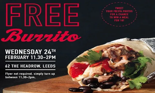Barburrito gave away 1,000 burritos at their Leeds Headrow branch; and ran a Facebook competition giving away burritos; and is offering a chicken burrito with a can of Coke for £7 throughout the month